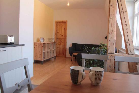 In der Küche lässt es sich reichhaltig und lecker kochen, backen und essen, sofern man nicht die schmackhafte regionale Gastronomie kosten möchte. Es stehen ein Ceranfeld mit Backofen, ein Kühlschrank, Geschirrspüler, Toaster, Wasserkocher, ein Essplatz und ausreichend Geschirr zur Verfügung. Beim frisch zubereiteten Kaffee, Tee oder Orangensaft nehmen die Gedanken freien Lauf, lässt es sich wunderbar miteinander diskutieren oder abends gemütlich auf der Couch im Wohnbereich abschalten bei Lektüre oder Spiel. Statt Fernseher gibt es schnelles Internet. Wir legen Wert auf gesunde Lebensmittel aus dem Garten, vom Bauern, Fleischer und Bäcker aus der Region. Bio-Laden, Supermarkt und andere Geschäfte sind zu Fuß erreichbar.